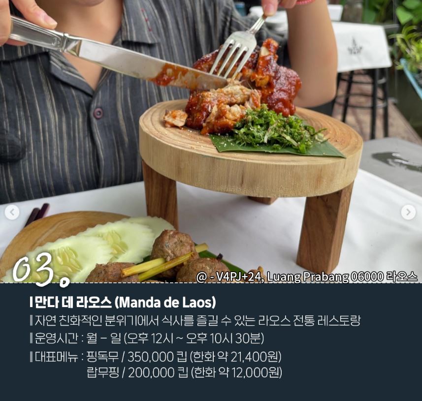 - 대표메뉴: 핑독무/ 350,000킵 (한화 21,400원), 랍무핑/200,000킵 (한화12,000원)